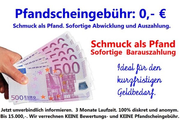 Unsere Schätzmeister bewerten die Gegenstände und ermitteln den Belehnungswert. Danach rufen wir Sie an und mailen Ihnen den Online Pfandschein, klären den gewünschten Überweisungsweg und zahlen den Betrag sofort aus.